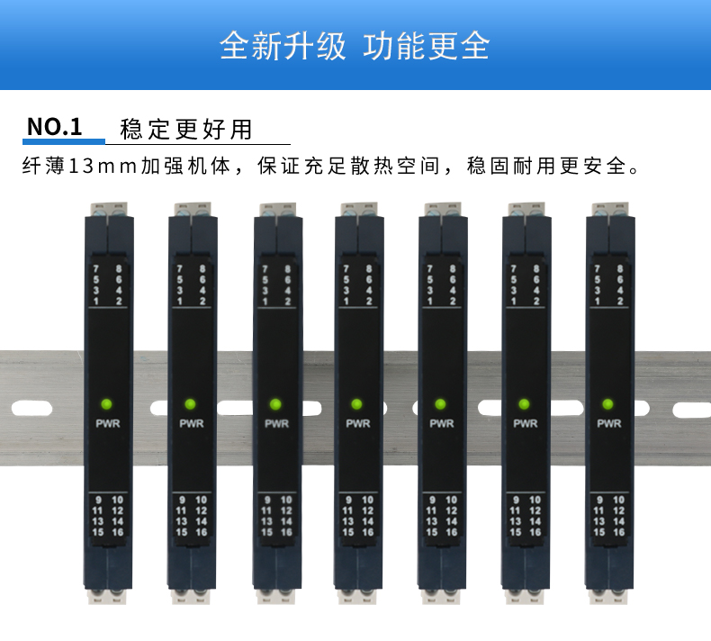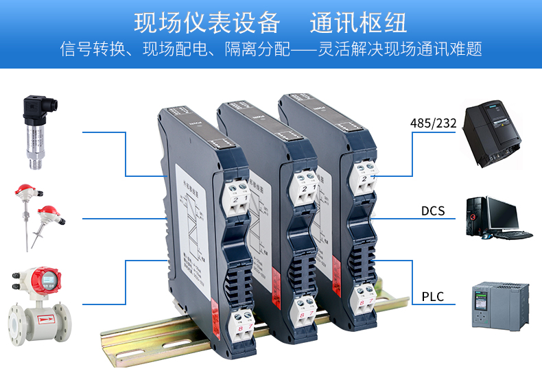 將PT100等熱電阻跟熱電偶信號轉換成各種電流、電壓等標準模擬量信號,可以與PC機、PLC、DCS等實現工控監測連接。抗干擾能力強,遠傳不受其他設備影響。輸入、輸出選擇范圍寬,準確度高。電源可選擇,導軌安裝便于檢測與安裝。廣泛應用于各種對溫度集中測量的監控系統中。