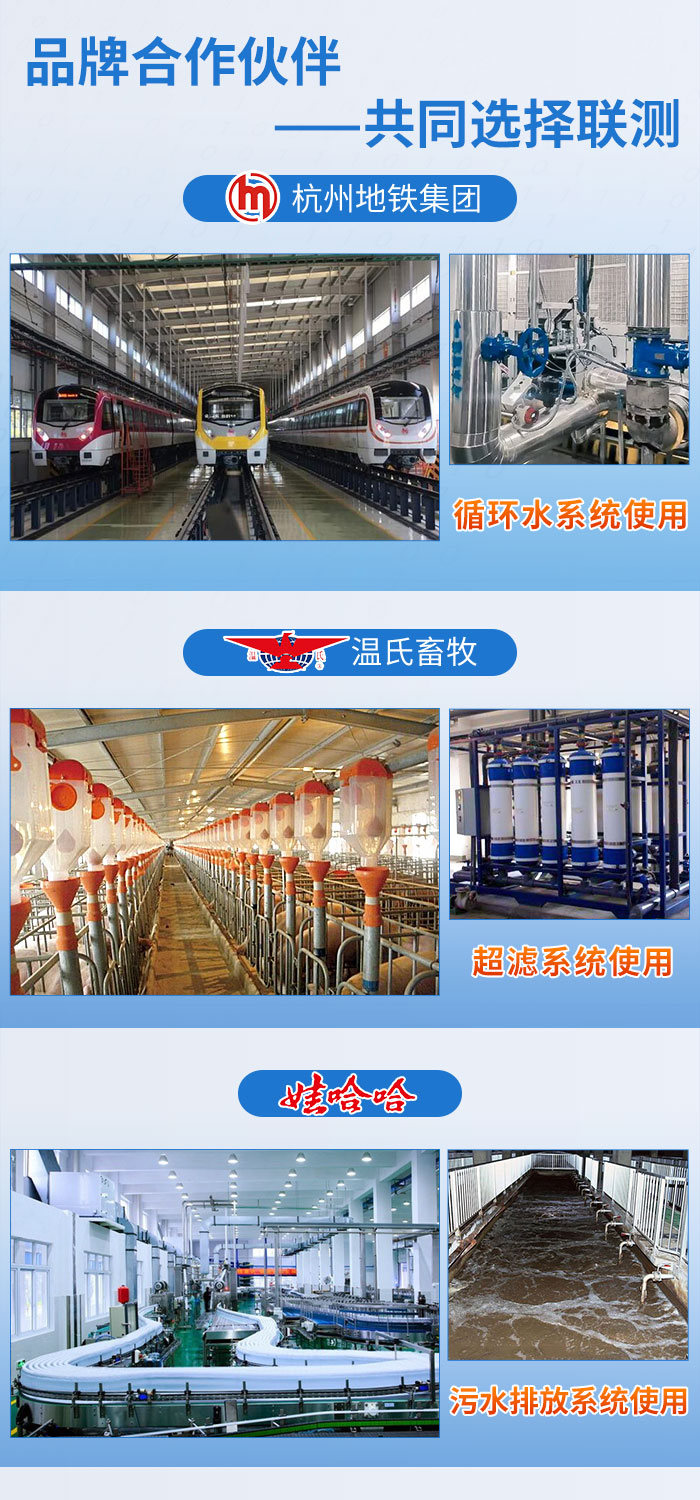 近年來,聯測儀表廣泛應用于各大領域,與國內品牌杭州地鐵集團、溫氏畜牧、娃哈哈......達成合作,專業的技術,敬業的服務贏得了諸多企業的信賴與支持。本次合作也給客戶留下了良好的印象,好評連連,溫州繞城高速公路有限公司表示,后續多個站點會批量使用我司電磁流量計。